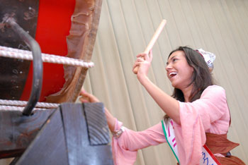 「福山ばら祭2008」に参加するために来日した、ブルガリアの日本語弁論大会で優勝したナデジュダ・ペトロヴァさんと、カザンラク市の07年バラの女王ローラ・ストヤノヴァさんは、16日、福山市東手城町の一ツ橋中学校を訪問し、生徒と交流しました。